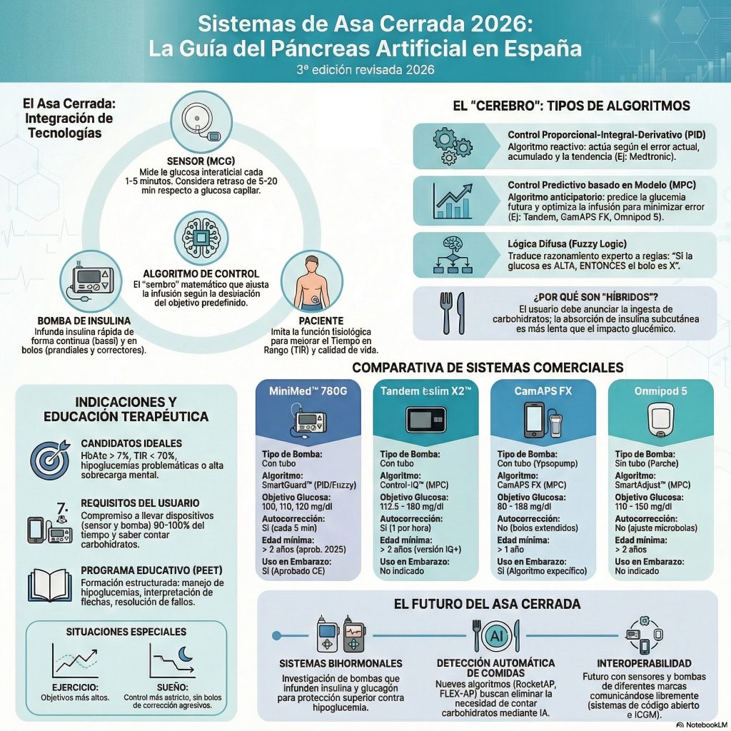 El artículo de Diabetes Care (2026) revoluciona el manejo de la DT1 al proponer la transición de un modelo «insulino-céntrico» a una terapia metabólica integral. Expone que la insulina inyectada es insuficiente, ya que genera hiperinsulinemia periférica, resistencia iatrogénica y no neutraliza el riesgo cardiovascular persistente. La solución radica en la integración de fármacos coadyuvantes (SGLT2i, GLP-1 y amilina) que corrigen la disfunción multihormonal, protegen riñones y corazón, y reducen la carga glucémica. Para garantizar la seguridad, el texto destaca la llegada de sensores duales (glucosa/cetonas) y bombas multihormonales que imitan la fisiología pancreática con precisión. Estos sistemas, impulsados