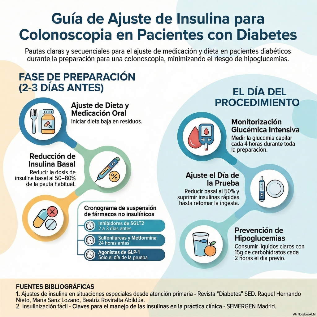 Estos documentos detallan las pautas clínicas necesarias para gestionar la diabetes de forma segura durante la preparación y ejecución de una colonoscopia . Debido a la falta de un protocolo universal, los textos enfatizan la importancia de realizar ajustes individualizados en la medicación, recomendando generalmente reducir la insulina basal a la mitad y suspender fármacos orales como la metformina o las sulfonilureas. Asimismo, se subraya la necesidad de realizar controles glucémicos constantes y mantener una ingesta controlada de carbohidratos líquidos para evitar episodios de hipoglucemia durante el ayuno. Los autores aconsejan programar la intervención a primera hora para facilitar el