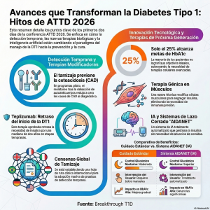 El artículo detalla los avances presentados en la conferencia ATTD 2026 sobre el tratamiento y diagnóstico de la diabetes tipo 1 . Se destaca la expansión global de programas de detección temprana y el uso de terapias modificadas de la enfermedad , como el teplizumab, para retrasar la dependencia de la insulina. Asimismo, se exploran innovaciones en terapias celulares y el potencial de la inteligencia artificial para automatizar la administración de fármacos mediante sistemas de circuito cerrado. El texto también introduce enfoques de terapia génica que permiten a las células musculares producir insulina sin necesidad de trasplantes complejos. Finalmente, se subraya la importancia de formar una nueva generación de especialistas para implementar estos descubrimientos científicos en la práctica clínica real.
