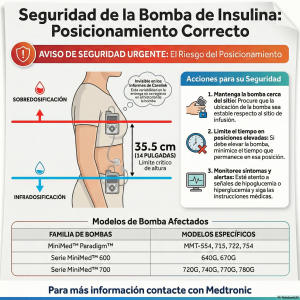 Esta notificación de seguridad urgente emitida por Medtronic advierte sobre un riesgo en la precisión de la dosificación de sus bombas de insulina de las series Paradigm, 600 y 700. El fabricante explica que la posición física del dispositivo en relación con el lugar de la infusión puede alterar la cantidad de medicamento suministrado debido a factores ambientales. Específicamente, colocar la bomba a más de 35,5 centímetros por encima o por debajo del sitio de inyección podría provocar niveles incorrectos de insulina, resultando en hipoglucemia o hiperglucemia. Para mitigar este peligro, instruye a los usuarios a mantener el aparato cerca del punto de entrada y limitar el tiempo que permanece elevado. La empresa se compromete a actualizar sus manuales de usuario para reflejar estas pautas críticas de seguridad y ofrece una línea de asistencia para resolver dudas. Estas recomendaciones son vitales para pacientes con alta sensibilidad a la insulina , quienes corren un mayor riesgo ante variaciones mínimas en su tratamiento.