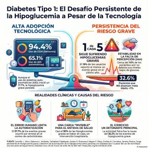 Este estudio longitudinal analiza cómo los eventos de hipoglucemia grave y la falta de percepción de los síntomas persisten en adultos con diabetes tipo 1, a pesar del uso de tecnología médica avanzada. Los investigadores compararon datos de dos encuestas realizadas con dos años de diferencia, observando que la adopción de sistemas de administración automatizada de insulina aumentó significativamente en este periodo. Sin embargo, aproximadamente el 20% de los participantes siguió sufriendo hipoglucemias críticas y un 30% mantuvo una conciencia reducida ante estos episodios peligrosos. Los resultados revelan que un tercio de los pacientes aún no alcanza sus objetivos de hemoglobina glucosilada, lo que sugiere que las herramientas actuales tienen límites. El informe concluye que, aunque la tecnología ha progresado, factores como el error humano al calcular carbohidratos mantienen el riesgo metabólico. Por ello, se subraya la necesidad de estrategias clínicas innovadoras y mejoras en el comportamiento del paciente para complementar los dispositivos digitales.