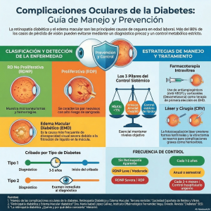 Estas fuentes informativas detallan la retinopatía diabética, una complicación visual grave derivada de niveles elevados de azúcar en sangre que dañan los vasos sanguíneos de la retina. El texto describe cómo la enfermedad puede evolucionar desde formas no proliferativas hasta estados avanzados que incluyen edema macular o desprendimientos de tejido, los cuales comprometen seriamente la vista. Se enfatiza que el diagnóstico precoz mediante exámenes oculares periódicos es fundamental para prevenir la ceguera irreversible en pacientes diabéticos. Además, se presentan diversas opciones terapéuticas como las inyecciones intravítreas, el uso de tecnología láser y procedimientos quirúrgicos para manejar las lesiones. Finalmente, el documento subraya la importancia de mantener un estilo de vida saludable y un control estricto de la glucemia para reducir los factores de riesgo asociados.