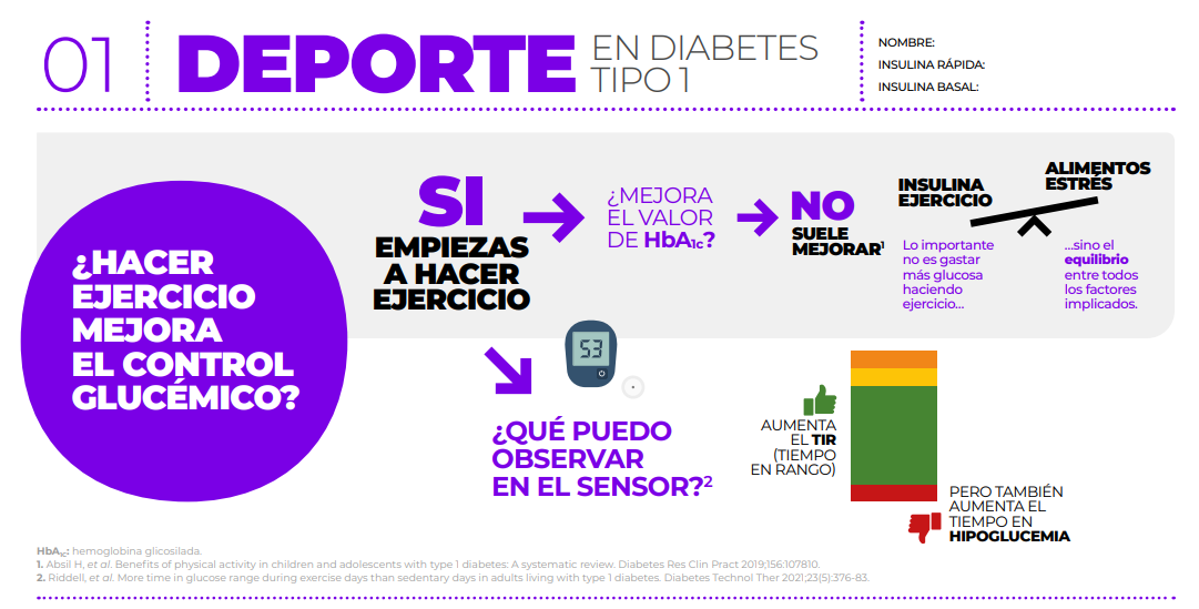 «No cabe duda de que el deporte y la actividad física mejoran la salud de las personas con y sin diabetes. Sin embargo, en el caso de la diabetes tipo 1, la práctica de ejercicio físico no siempre se relaciona con un mejor control de la glucemia. Lo importante no es gastar más o menos cantidad de glucosa, sino mantener un equilibrio entre los diferentes factores implicados en el control glucémico (consumo de glucosa, insulina, alimentos o estrés, entre muchos otros). Es por ello que los estudios realizados hasta el momento, no muestran mejoría en los niveles de hemoglobina glicosilada (HbA1c) con la realización de ejercicio físico.