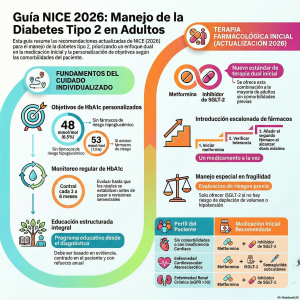 Esta guía clínica detalla el manejo integral de la diabetes tipo 2 en adultos , subrayando la importancia de un enfoque personalizado centrado en el paciente. El documento ofrece directrices actualizadas sobre el control de la glucosa , incluyendo el uso de tecnologías de monitoreo continuo y la fijación de objetivos de HbA1c adaptados a cada individuo. Se proporcionan esquemas terapéuticos específicos para personas con comorbilidades como insuficiencia cardíaca, enfermedad renal crónica u obesidad, destacando el papel de los inhibidores de SGLT-2 y los agonistas de GLP-1. Además, la fuente resalta la relevancia de la educación estructurada , el asesoramiento dietético y la toma de decisiones compartida respecto al tratamiento con insulina. Finalmente, se abordan protocolos para situaciones especiales, tales como días de enfermedad , fragilidad y la prevención de complicaciones cardiovasculares o visuales.
