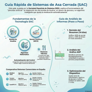 Esta guía técnica de la Sociedad Española de Diabetes detalla el funcionamiento de los sistemas de asa cerrada , los cuales integran sensores de glucosa con bombas de insulina mediante algoritmos inteligentes. El documento ofrece un análisis comparativo de varias tecnologías: Medtronic 780G , Tandem Control-IQ, CamAPS , (Omnipod 5 no está incluido en la Guía Rápida) especificando sus componentes, criterios de uso y configuraciones automáticas. Se explica minuciosamente cómo interpretar los informes de datos para optimizar el control glucémico, destacando parámetros como el tiempo en rango y los bolos correctores. Además, proporciona recomendaciones prácticas sobre la gestión de modos especiales para el ejercicio o el sueño y las causas que pueden interrumpir el funcionamiento automático. El objetivo final es servir como un recurso de consulta rápida para que profesionales y pacientes logren una terapia personalizada y eficaz.
