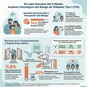 Este artículo científico analiza las consecuencias psicológicas y conductuales de los programas de detección temprana de la diabetes tipo 1 en la población general. Los autores examinan cómo las familias y los profesionales de la salud procesan el riesgo de padecer la enfermedad, destacando que muchos padres tienen dificultades para comprender los resultados positivos. Se observa que la identificación de autoanticuerpos genera niveles significativos de ansiedad específica, especialmente en aquellos con mayor riesgo genético o falta de experiencia previa con el padecimiento. Además, la investigación explora la disposición a participar en el seguimiento médico continuo y el impacto que tienen los nuevos fármacos para retrasar el inicio de los síntomas. El texto concluye subrayando la necesidad de implementar intervenciones de apoyo emocional y mejorar la comunicación sobre los beneficios de la detección precoz.