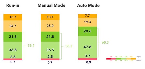 Tabla 2: Métricas glucémicas durante la fase de preinicio, el periodo de modo manual y el periodo de modo automático. Durante el modo manual, se activó la función de suspensión antes del nivel bajo (SBL). Durante el preinicio, el sistema también se utilizó en modo manual con SBL activado. Los datos se muestran como media ± DE.