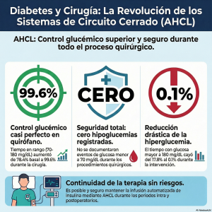 «Este estudio clínico evalúa la seguridad y efectividad de los sistemas de infusión automatizada de insulina, específicamente el modelo MiniMed™ 780G , durante los procedimientos quirúrgicos. La investigación demuestra que el uso de esta tecnología híbrida de circuito cerrado mejora significativamente el control glucémico de los pacientes durante el periodo perioperatorio . Los resultados indican un incremento notable del tiempo en rango y una ausencia de eventos de hipoglucemia grave o complicaciones técnicas durante las cirugías. El análisis concluye que es viable mantener el funcionamiento de estos dispositivos bajo supervisión médica, ofreciendo una alternativa más precisa que el cuidado convencional. No obstante, los autores subrayan la necesidad de realizar ensayos clínicos aleatorios más extensos para validar estos hallazgos en cirugías de mayor complejidad y duración.»